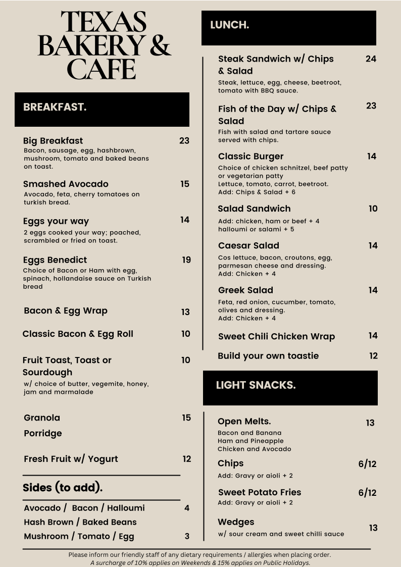 Time spent at Texas Bakery, Cafe and Groceries is truly enhanced by the friendly and dedicated staff, always ready to serve with a smile. According to customer feedback, the atmosphere is as inviting as the food is delicious. One customer, Peter Palis, praises the bakery items as "fantastic" and shares that the cheerful service adds to the overall experience. Another patron, Julie Cairns, notes the wonderful breakfast experience she enjoyed, calling both the food and coffee "delicious." These sentiments echo through countless reviews, establishing the café as a beloved stop for locals and travelers alike.